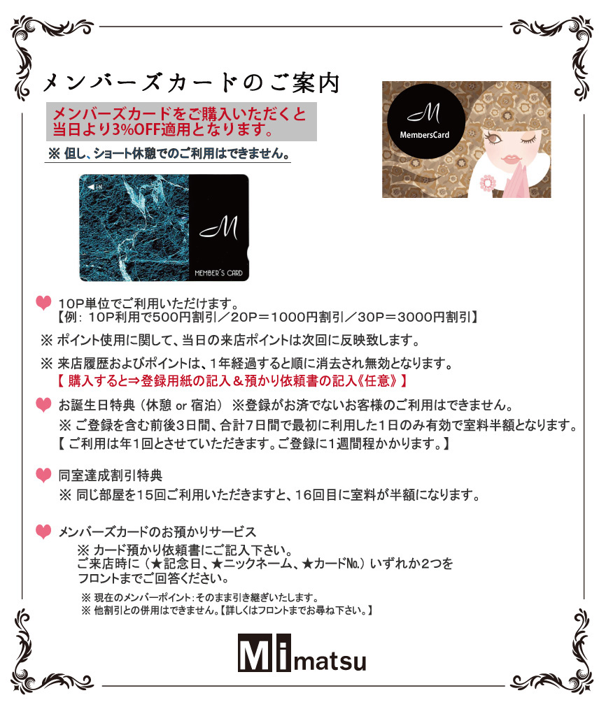 2019/04/18 お得なメンバー メンバーズカードのご案内 メンバーズカードご購入いただくと当日より3%OFF適用となります。※ただし、ショート休憩でのご利用はできません。 ◇初回 0ポイント: 3%OFF ◇1回目~30P: 5%OFF ◇31P~60P: 10%OFF ◇61P~120P: 15%OFF ◇121P~: 20%OFF ◇ご休憩獲得ポイント ご来店1回に付 →1P ◇ご宿泊獲得ポイント ご来店1回に付 →2P